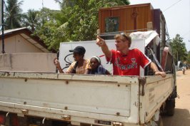 ![]() Ich klettere von der Ladefläche des Lastwagens, auf der Schränke, Tische, Stühle, 76 Schultaschen und Schuhe in unterschiedlichsten Kindergrößen, Nägel, Schrauben, ein großes Schild und viele Kleinigkeiten, etwa zwei Bügeleisen und Medizin für das Mädchenheim in Palugamam verstaut sind. Zwei Stunden haben mir Staub, Hitze und die zahllosen Schlaglöcher zugesetzt, leicht schwindelig nähere ich mich der wartenden Schlange, die erschrocken oder ist es nur verwundert vor mir zurückweicht.